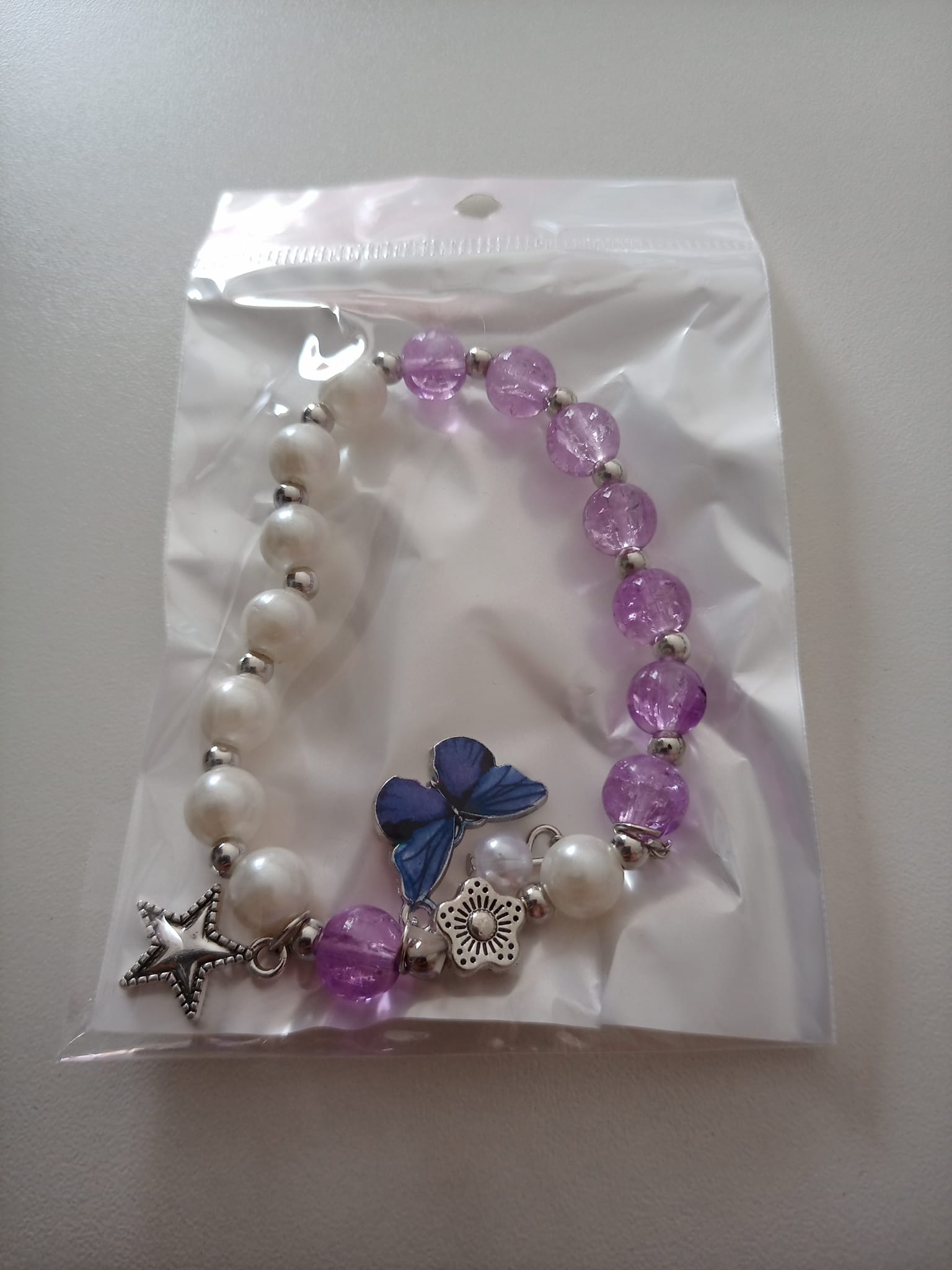 Portada » Shop » PULSERA BLANCA Y LILA CON DETALLE DE MARIPOSA