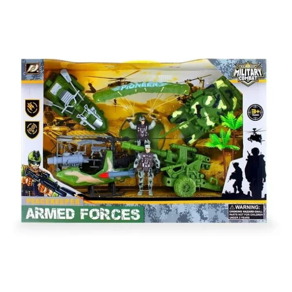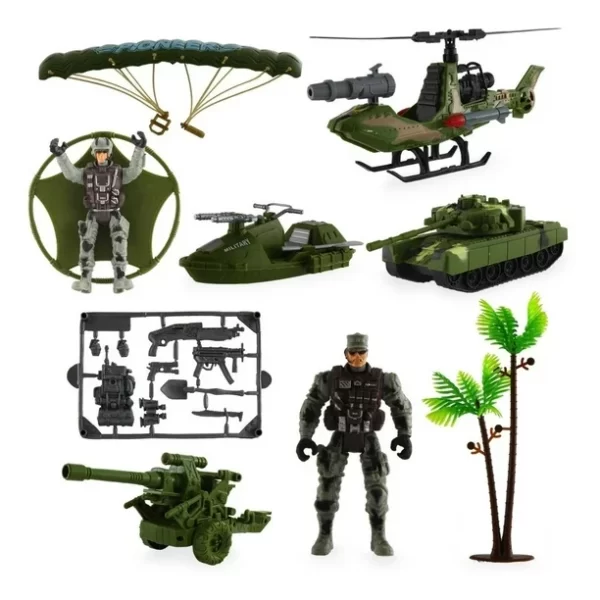 1 soldado de juguete, 1 helicóptero, 1 tanque, 1 camioneta, 1 camioneta armada, 1 lancha.